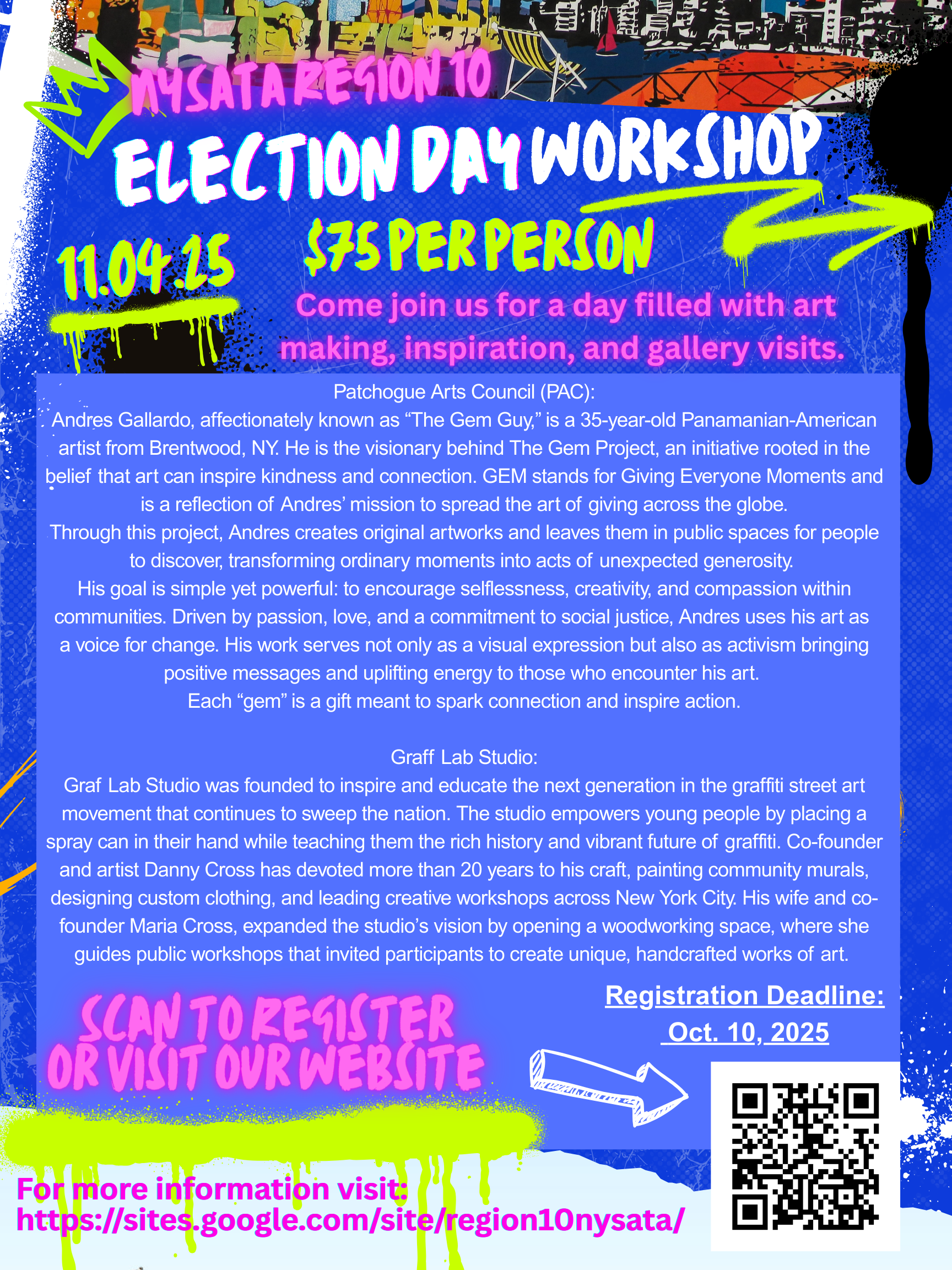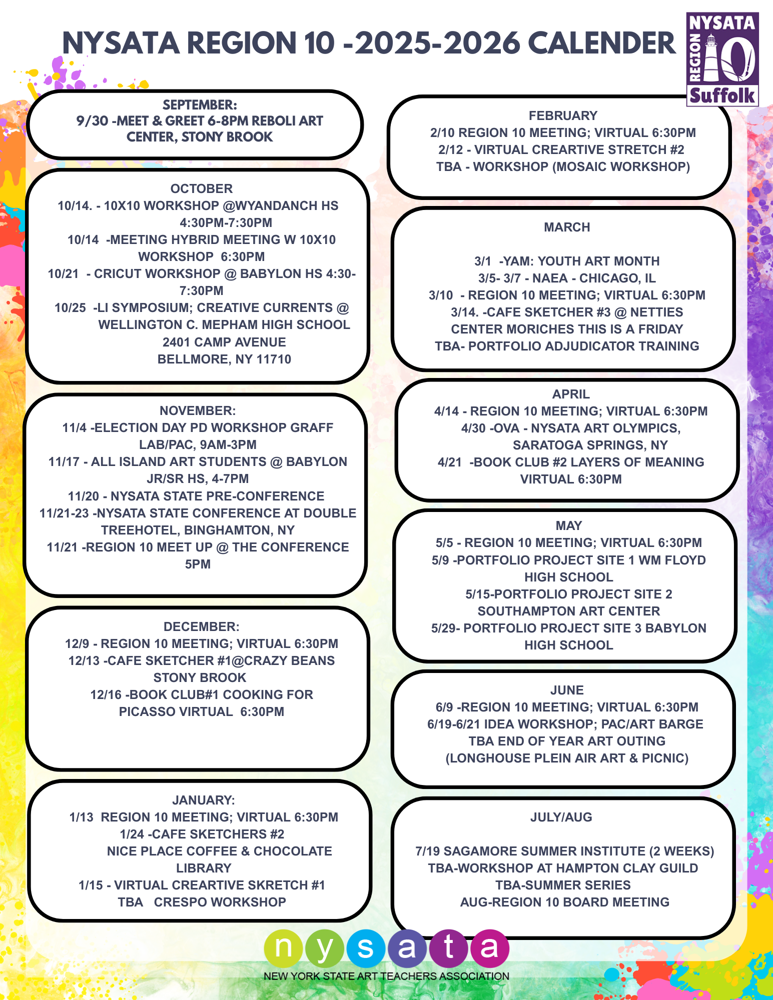 We have upcoming Meet & Greet, 10x10 Workshop, LI Symposium, Election Day Conference and *NEW* All Island Art Students